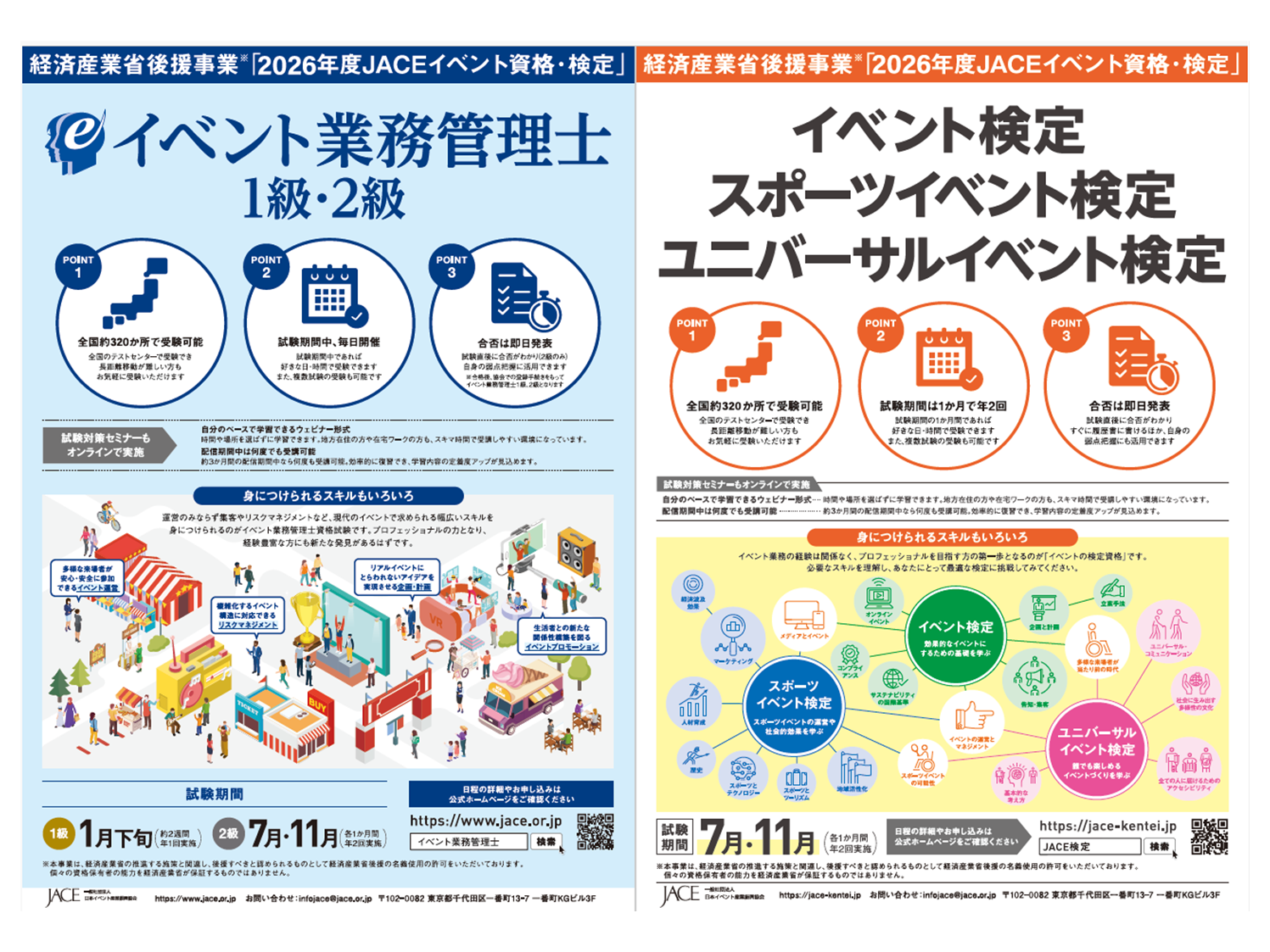JACEでは、実務経験が必要なイベントのプロフェッショナル向けの「イベント業務管理士」資格試験の他に、実務経験を問わない、どなたでも受験可能な「3つのイベント検定」を開催しております。イベントビジネスの基礎知識や基本スキルを身に着けられるものとなっておりますので、是非こちらにも挑戦してみてください。