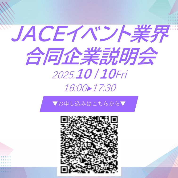 このたびこのたび学生のみなさま向けに、イベント業界および業界の企業をご紹介する「JACEイベント業界合同企業説明会」をウェビナー形式で開催することとしました